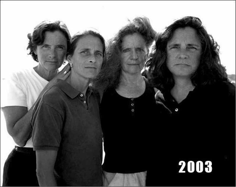 Een trend die steeds terug keert gedurende deze jaren is natuurlijkheid. Maar als de jaren verstrijken zie je ook een bepaalde zachtheid steeds terugkeren. Je merkt dat de zussen in de foos erg om elkaar geven. Deze foto van 2003 laat zien hoe Heather liefkozend haar hand op Mimi’s hoofd legt. De zussen zien er ontspannen uit en niks zit ze in de weg.