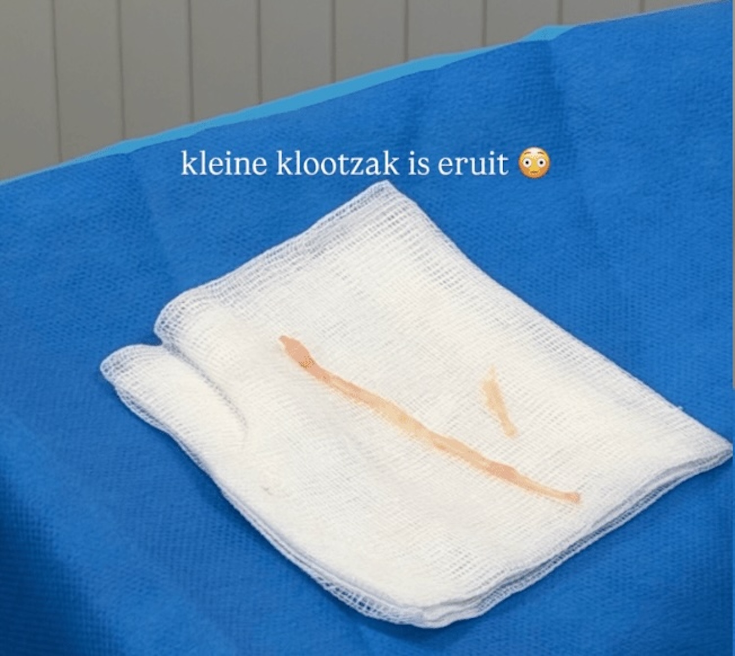 Het moment dat voor veel mensen als kantelpunt werd ervaren, volgde kort daarna. Er verscheen een foto van wat tijdens de behandeling was verwijderd. Het ging om een duidelijke close-up, zonder vervaging of context. Op een steriel gaasje lag een langwerpig stuk weefsel zichtbaar in beeld. Olcay plaatste daarbij een korte, directe tekst, die de situatie volgens haarzelf moest relativeren, maar juist extra aandacht trok.