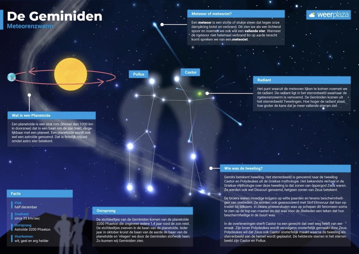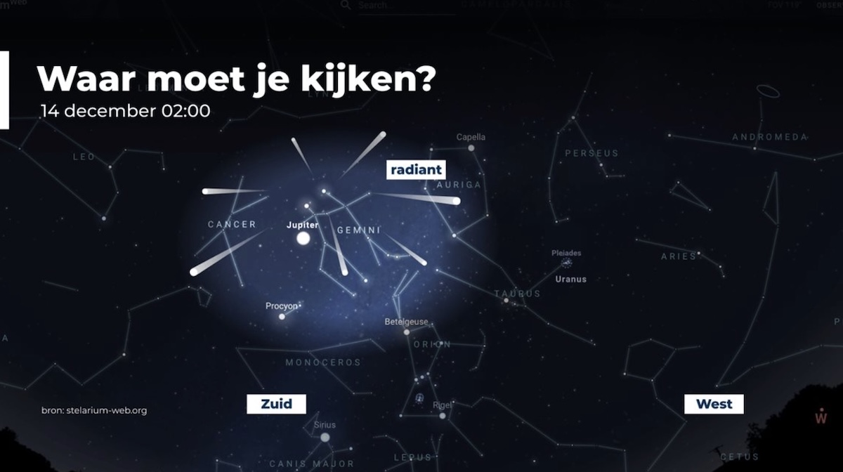 Het mooie aan een meteorenzwerm is dat je niet één vaste richting hoeft op te kijken. De meteoren kunnen overal langs de hemel verschijnen. Toch lijkt het alsof ze allemaal uit één punt komen, de zogenaamde radiant. Tijdens de pieknacht staat deze radiant aan de zuidelijke hemel, bij het sterrenbeeld Tweelingen. Dat sterrenbeeld is eenvoudig te herkennen als je weet waar je moet zoeken.