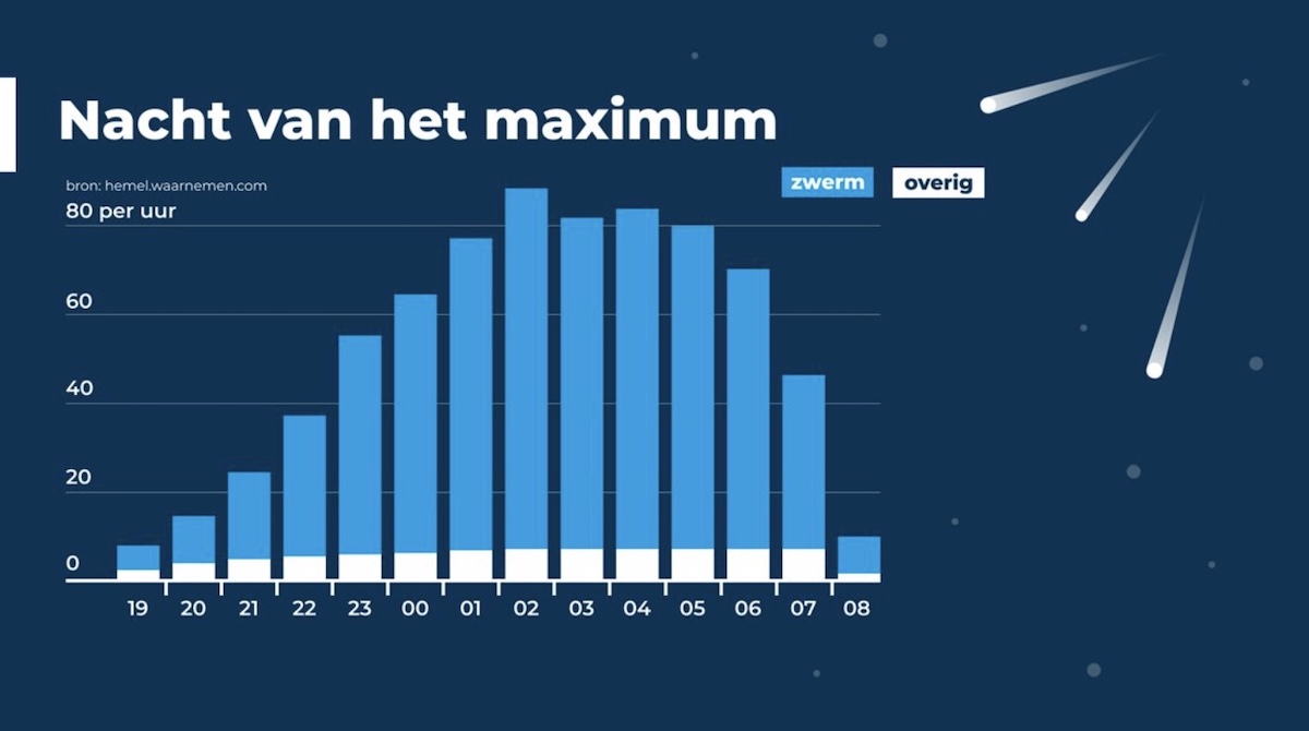 Dat aantal is natuurlijk afhankelijk van het weer. Met een wolkendek boven je hoofd zie je helaas niets. Gelukkig is de maan in die periode nauwelijks verlicht, waardoor het donker genoeg is om de lichtsporen goed te kunnen zien. Ook op de dagen voor en na de piek zijn vallende sterren zichtbaar, maar in veel kleinere aantallen. De Geminiden hebben namelijk een scherpe piek die ongeveer één dag duurt, dus die nacht is het echte moment om te kijken.
