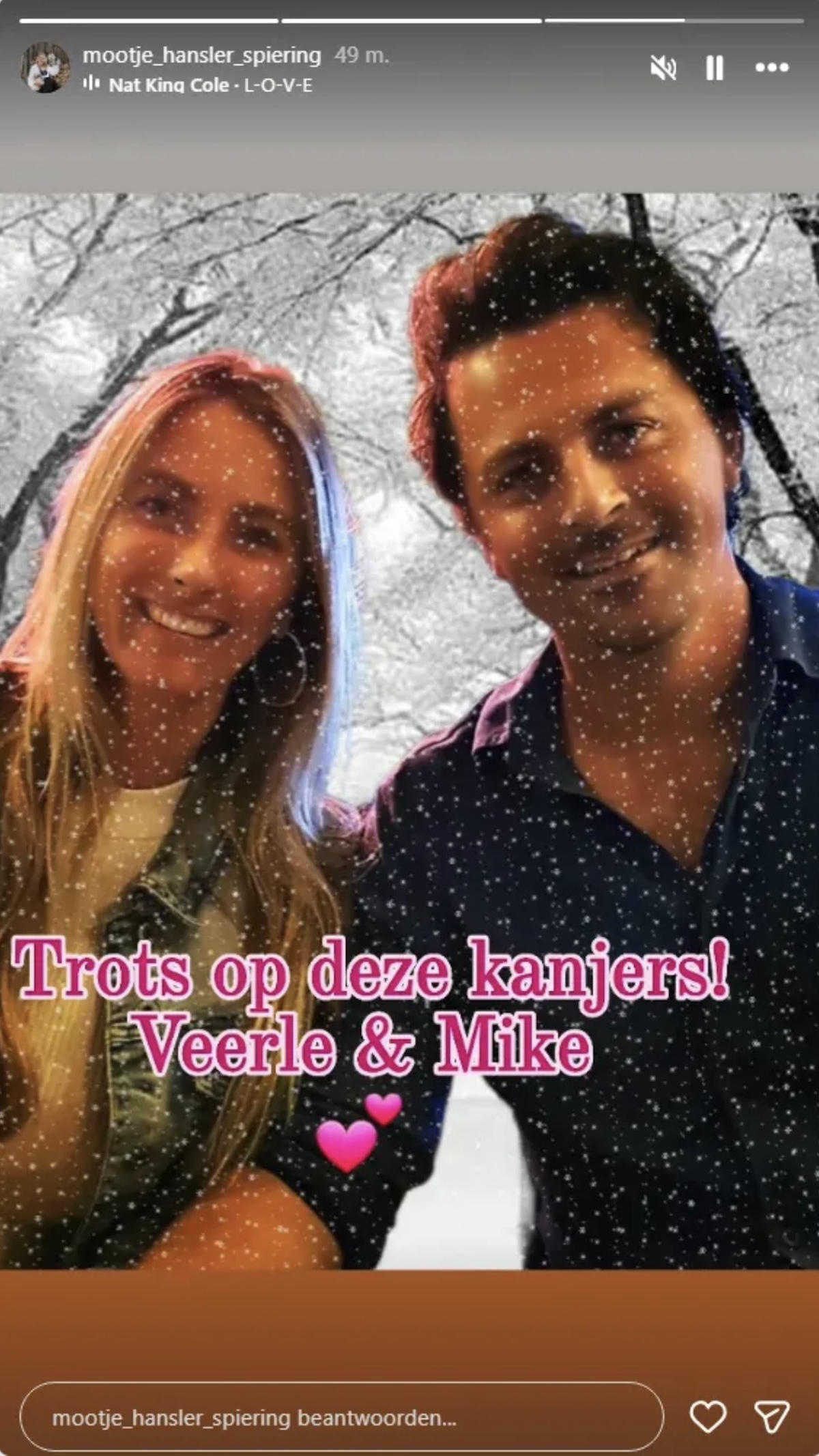 Niet veel later bevestigde Monique het nieuws aan Shownieuws. Ze liet weten dat Mike en Veerle ‘al een hele tijd samen zijn’ en dat ze zelfs samenwonen in Spanje. Monique vond dat het tijd was dat de relatie openbaar werd gemaakt. Ze plaatste de foto’s zonder overleg, maar volgens haar was dat prima. Ze wilde haar trots gewoon graag delen.