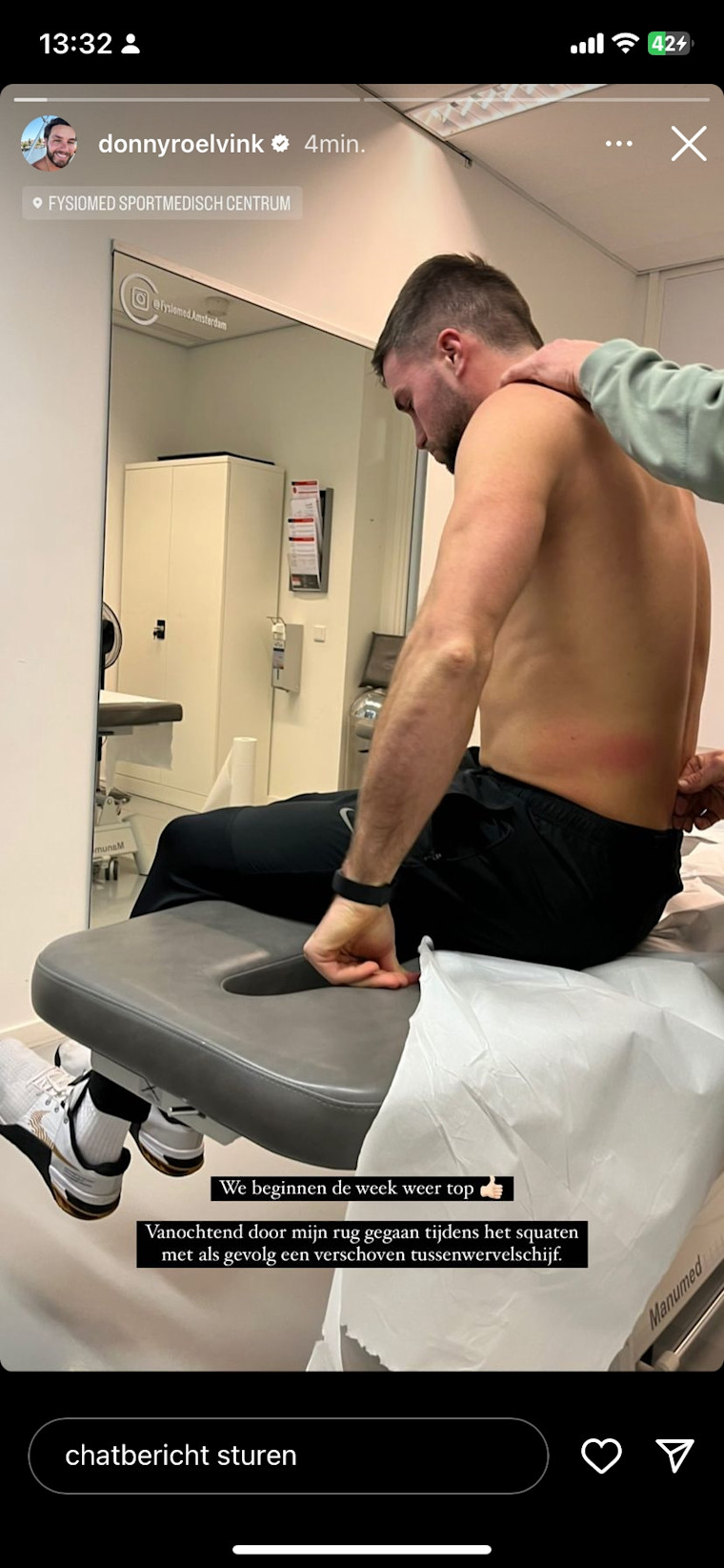 “We beginnen de week weer top” begint Donny zijn Instagram verhaal. Hij deelt een foto waarin hij behandeld wordt door een fysiotherapeut. “Vanochtend door mijn rug gegaan tijdens het squaten met als gevolg een verschoven tussenwervelschijf”. Op de foto is te zien hoe Donny behandeld wordt voor zijn verwonding.