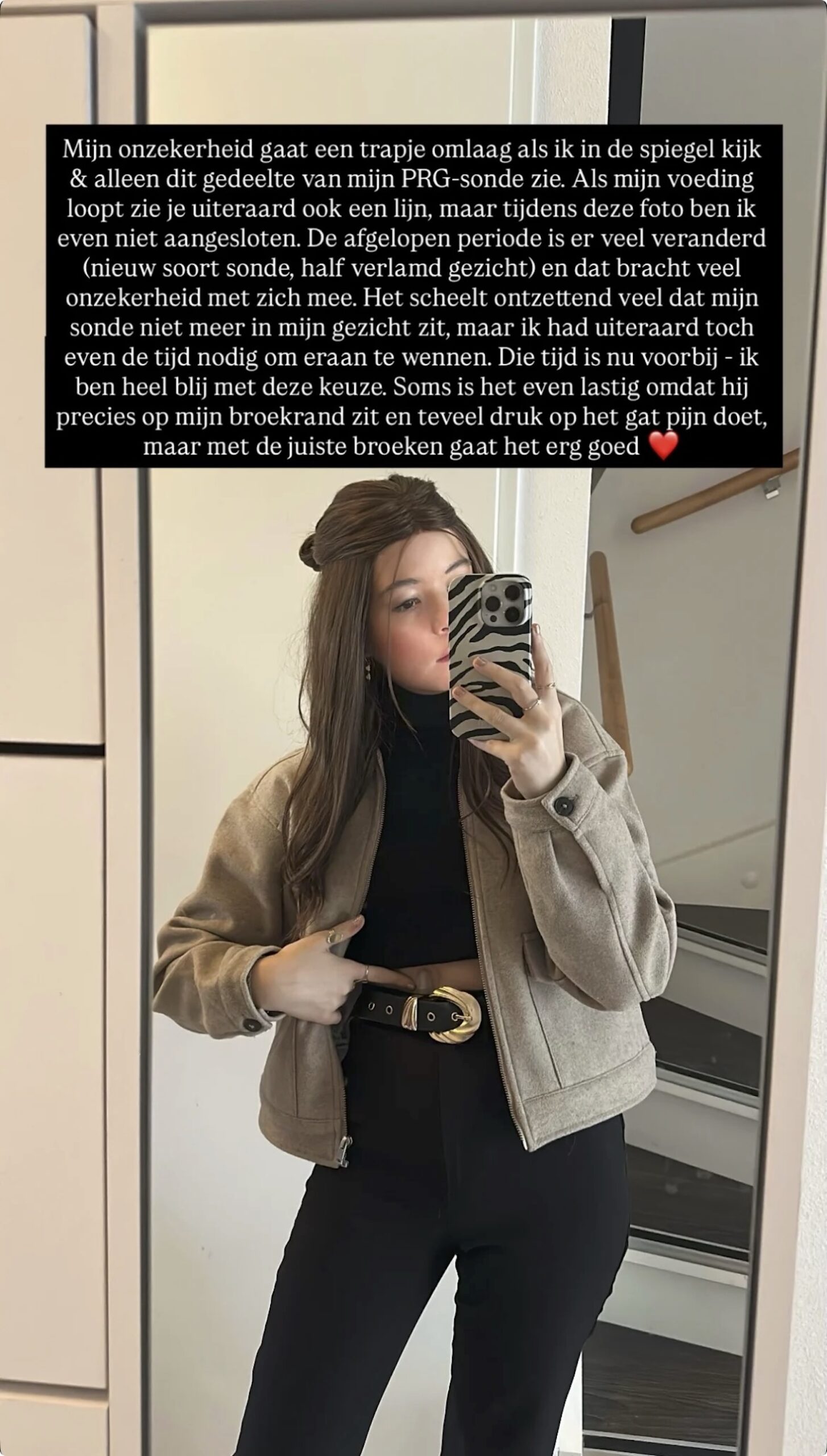 “Mijn onzekerheid gaat een trapje omlaag als ik in de spiegel kijk en alleen dit gedeelte (zie de onderste story, red.) van mijn PRG-sonde zie. Als mijn voeding loopt zie je uiteraard ook een lijn, maar tijdens deze foto ben ik even niet aangesloten.”