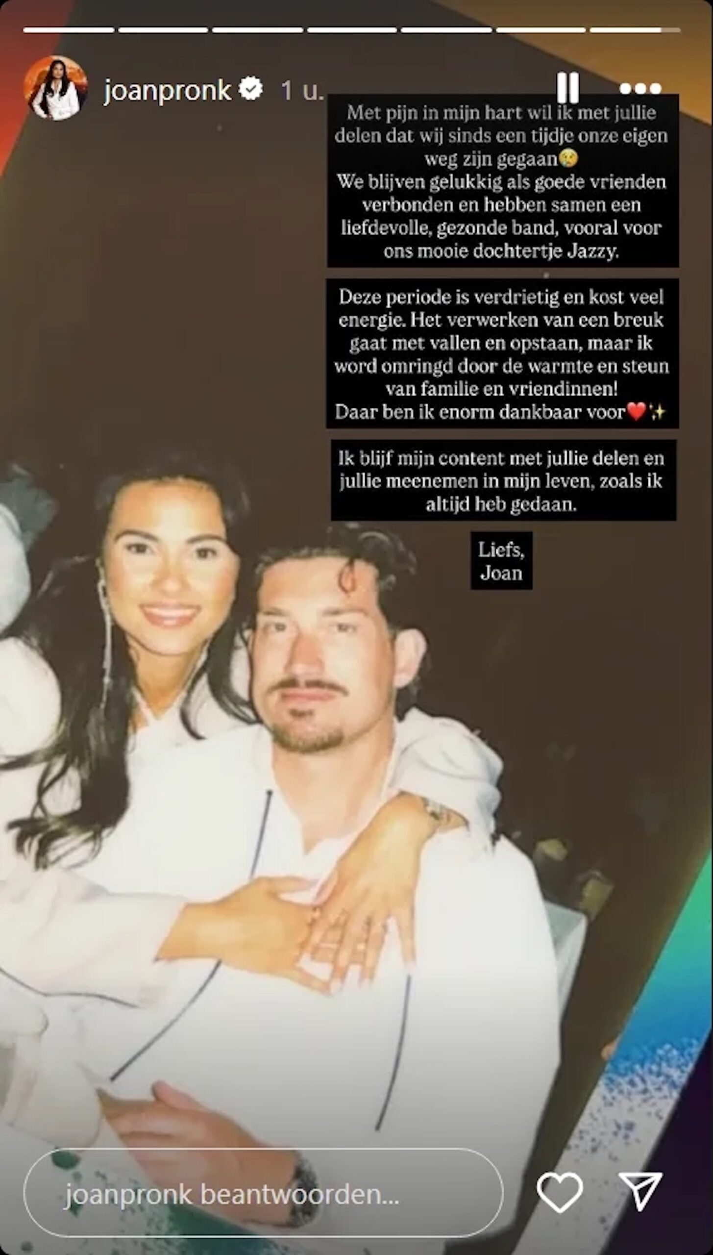 In haar Instagram Story schreef Joan: “Met pijn in mijn hart wil ik delen dat wij al een tijdje onze eigen weg zijn gegaan. We blijven verbonden als vrienden en hebben een liefdevolle band, vooral voor onze dochter Jazzy.” Die woorden laten zien dat ze het beste willen voor hun kind, ook al is hun relatie voorbij.