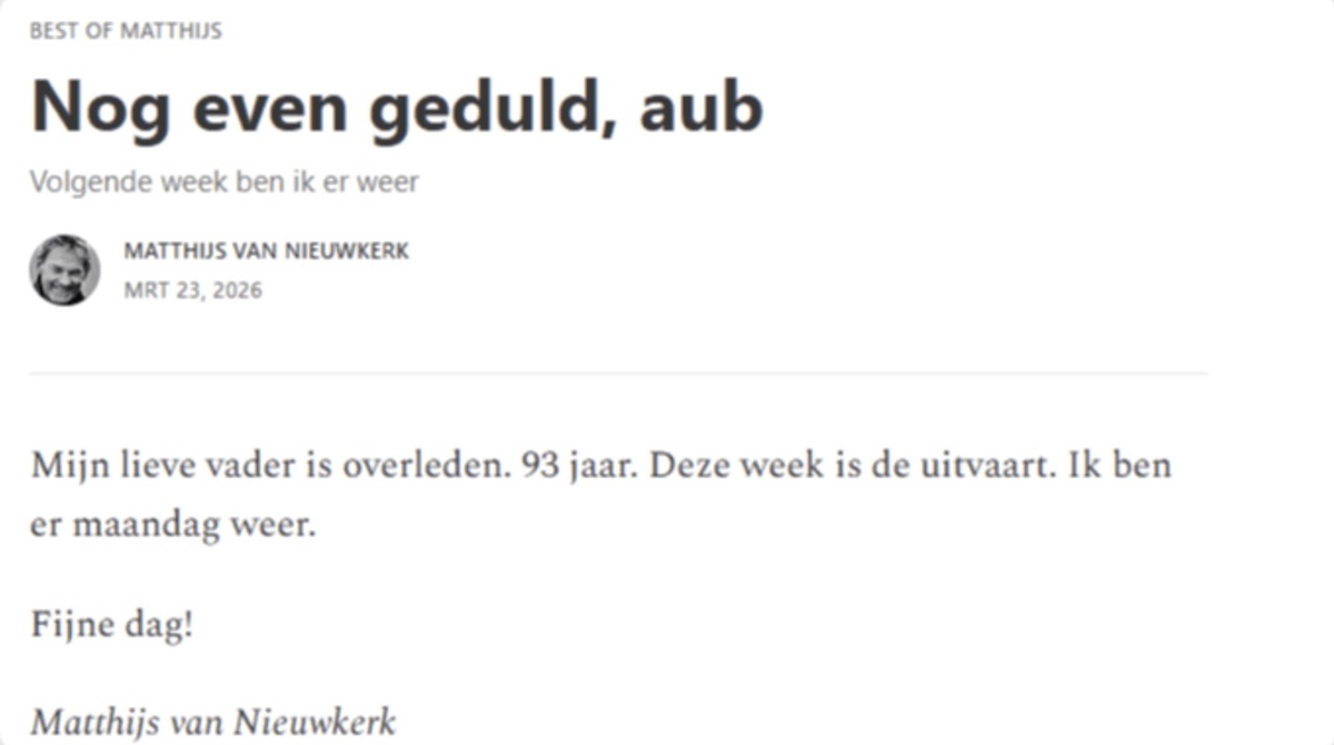 In zijn dagelijkse nieuwsbrief is Matthijs vaak open en direct. Hij schrijft in een stijl die dicht bij hemzelf ligt. Dat maakt het contact met zijn lezers persoonlijk. Dit keer gebruikte hij datzelfde platform om verdrietig nieuws te delen. Hij schreef dat zijn vader is overleden en noemde zijn leeftijd. Verder gaf hij aan dat de uitvaart deze week plaatsvindt.